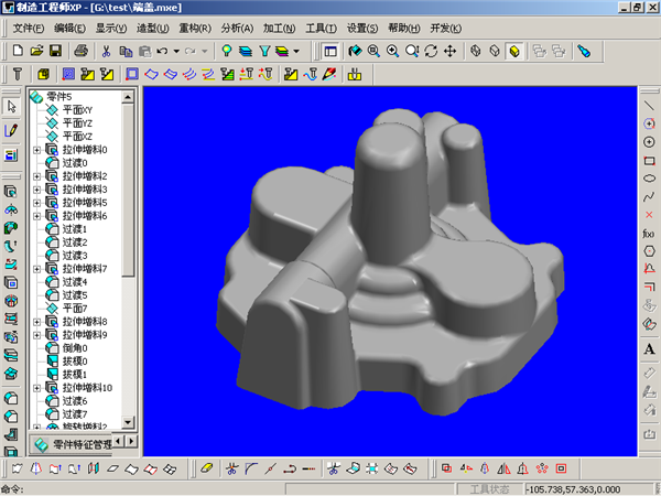 采用精确的特征实体造型技术,可将设计信息用特征术语来描述,简便而准确。通常的特征包括孔、槽、型腔、凸台、圆柱体、圆锥体、球体和管子等,CAXA制造工程师可以方便地建立和管理这些特征信息。实体模型的生成可以用增料方式,通过拉伸、旋转、导动、放样或加厚曲面来实现,也可以通过减料方式,从实体中减掉实体或用曲面裁剪来实现,还可以用等半径过渡、变半径过渡、倒角、打孔、增加拔模斜度和抽壳等高级特征功能来实现。