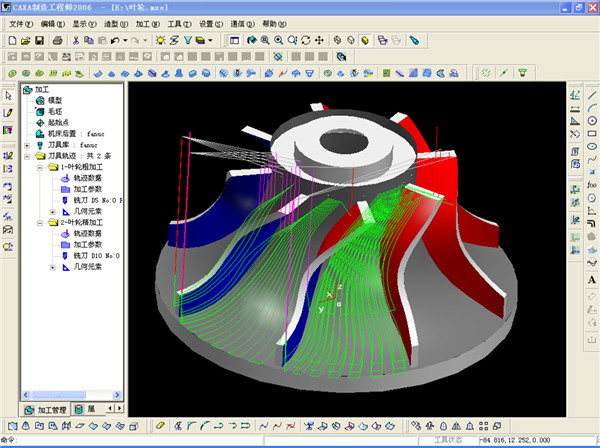 五轴加工:五轴等参数线、五轴侧铣、五轴曲线、五轴曲面区域、五轴G01钻孔、五轴定向、转四轴轨迹等加工对叶轮、叶片类零件,除以上这些加工方法外,系统还提供专用的叶轮粗加工及叶轮精加工功能,可以实现对叶轮和叶片的整体加工。