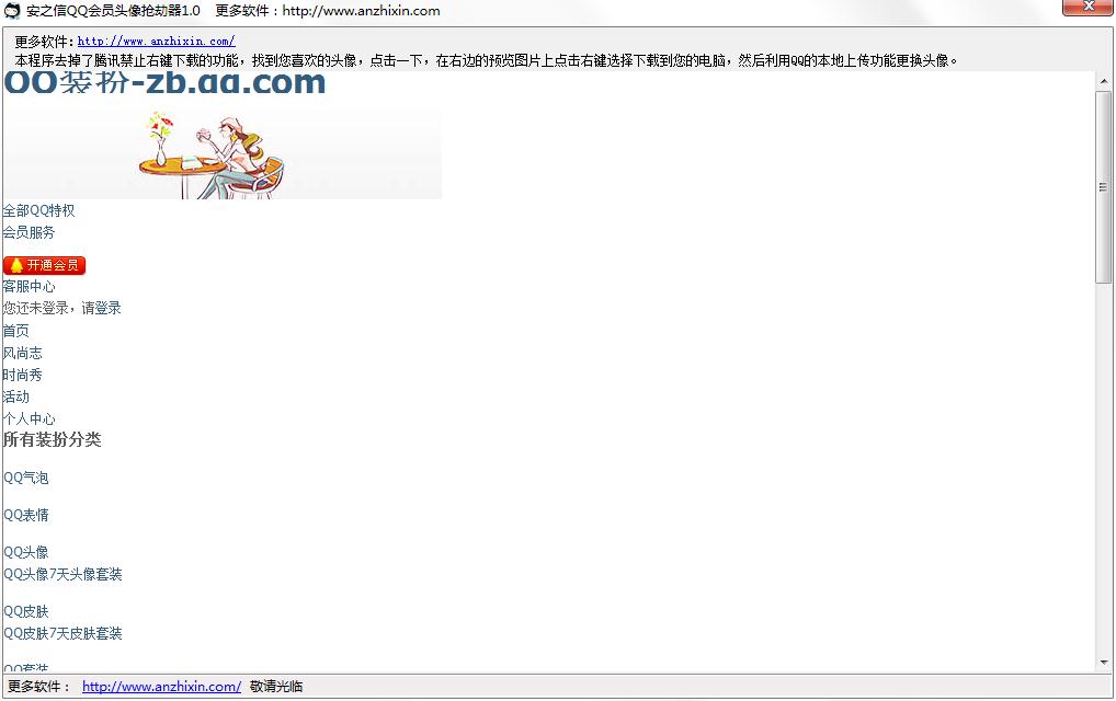 安之信QQ会员头像抢劫器,一款可以去掉了腾讯官方QQ头像网站的禁止右键下载的功能,可以任意下载您喜欢的QQ会员头像,找到你喜欢的头像点击一下,在右边的预览图片上点击右键选择下载到您的电脑,然后利用QQ的本地上传功能更换头像。