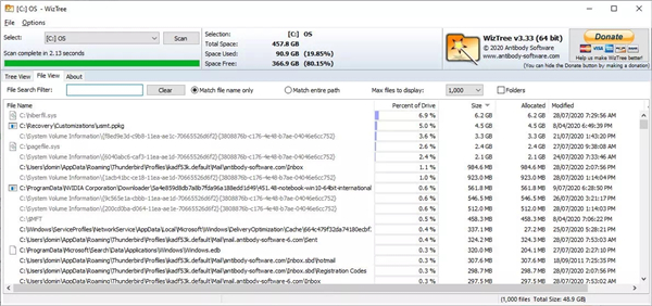 运行后,选择某个分区,点击“scan”按钮,等待几秒就可以看到结果了,扫描使用的时间在扫描结束后也可以在界面上看到。而对分区格式的话,WizTree有一些要求,那就是只能扫描NTFS格式的分区。