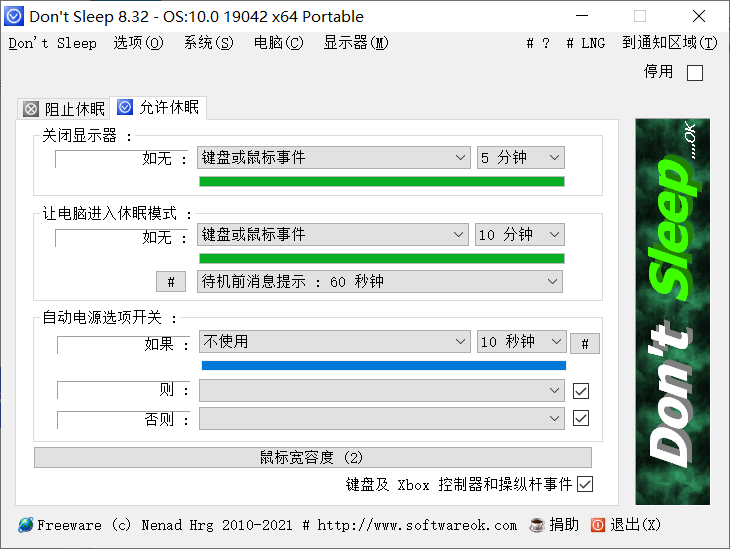 Dont Sleep能够有效防止系统关机、待机、休眠、重启、屏蔽失效等。比如说,有时候我们需要用电脑下载一个较大的东西的时候,往往就是让电脑下载的时候我们就去忙别的了,长时间电脑没有操作动作,这时候系统可能就会自动关机、自动待机或者开启休眠模式,以至于下载的东西根本就没下载完成。这款软件就是用来帮助你的电脑防止系统关机、待机、休眠。