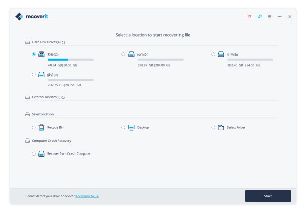 万兴恢复专家会自动识别电脑上的磁盘分区,通常用户都会用C盘来装系统文件,而D盘或者E盘则用来存储一种重要的数据文件。
