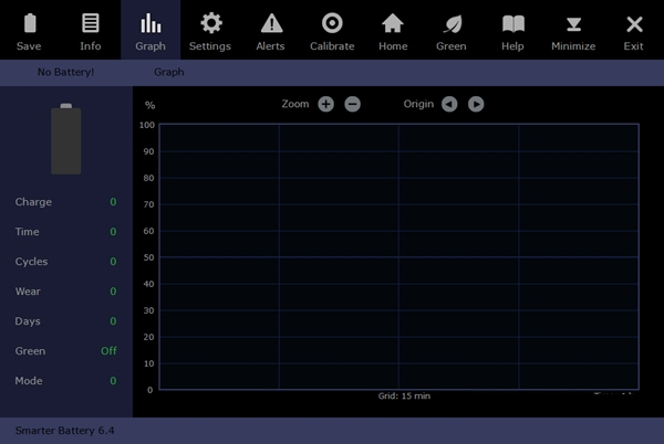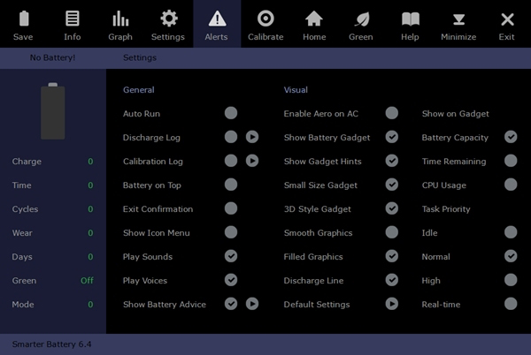 Smarter Battery的设置页面包含了所有的方案选项。如果在此处修改了某个选项,则会立即执行;但是,如果要在以后的会议中保留此更改,则必须使用左上角的“保存”按钮来保存设置。
