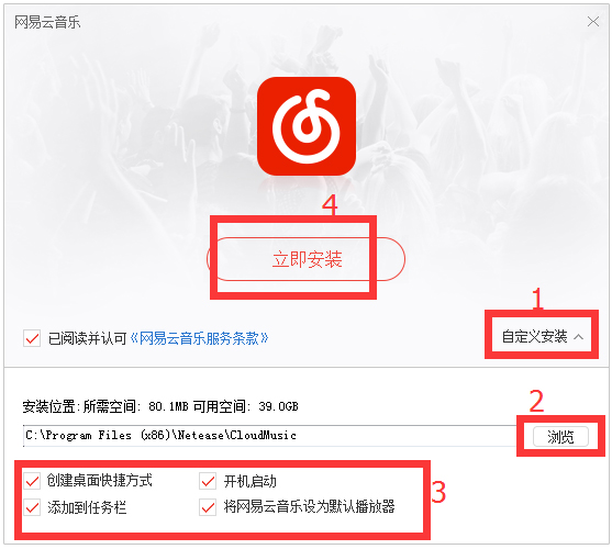2. 选择自定义安装,这样就选择安装地址,自定义设置为开启启动等,设置后点击安装。