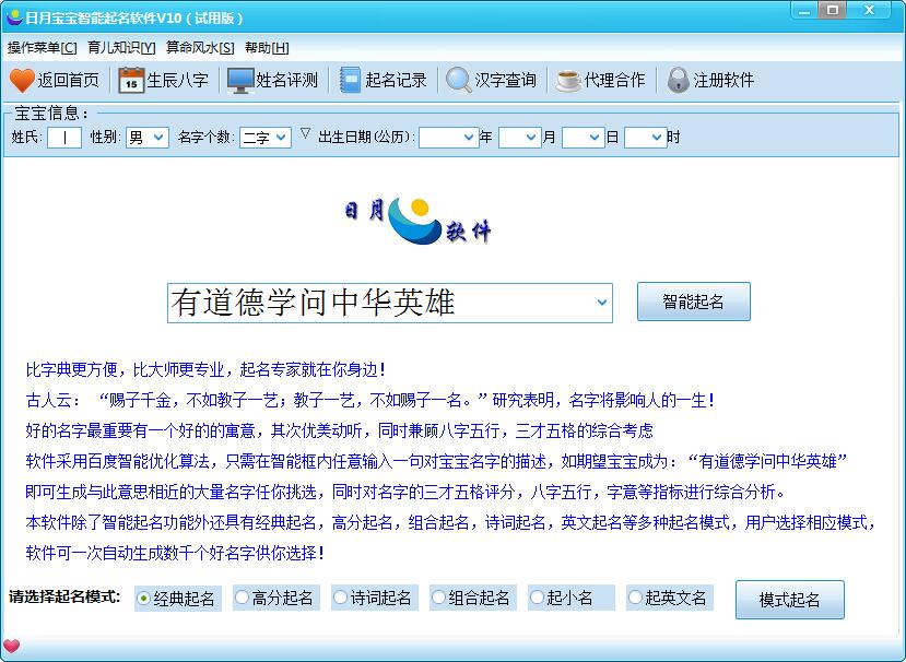 日月宝宝智能起名软件是一款帮助用户智能取名的软件,软件采用智能引擎库,可以根据宝宝的信息生成大量的好名字供用户选择。