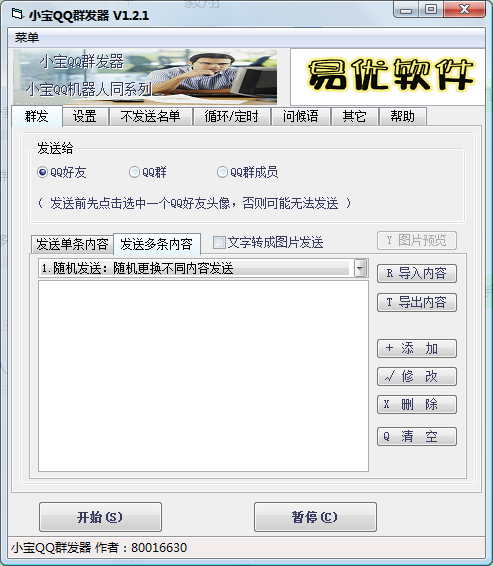 注意:由于腾讯的限制,一般几个到几十个就会QQ强制掉线(或临时限制/冻结),也可能出现对方收不到的情况,没有解决办法!