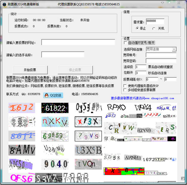 刷票器2014是最新版的一款功能强大的免费通用网络投票刷票软件,适用于各种网站的投票评选活动的投票刷票辅助,可以实现一台电脑实现多次重复投票快速刷票,对于有IP限制的网站投票,有验证码的网络投票都有良好的应付方法。。采用最新、最全、最稳定、安全等投票方式,确保用户的票数遥遥领先。突破了同类软件的纯模拟手工,采用GET,POST方式提交数据到服务器,提高了投票速度的5倍以上,减少人工疲劳。经过长时间的实践测试,功能更强大完善。图型识别功能,能够快速破解验证码,识别各大知名网站的图型验证码。部分网站还能使用代理IP或伪造IP等技术突破IP限制,能在局域网内或网吧里或通过路由器等不可更换IP的电脑上使用。