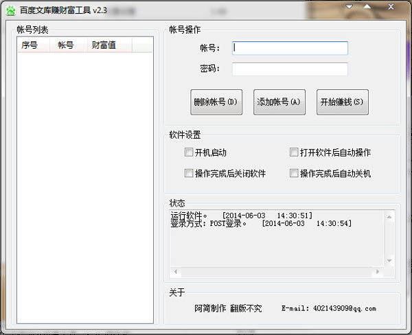 1、输入账号密码--》 点击“添加账号”--》 点击“开始赚钱” --》(会全自动操作评论百度文库文档和文辑,每天赚取10点财富值)。