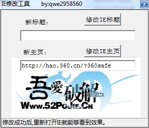 吾爱IE修改工具(IE标题主页修改工具)可以修改IE首页设置,并不会在系统里添加任何程序代码,所以,如果你的系统已经中了木马或恶意程序,使用本工具设置可能失败或设置成功也不起作用。吾爱IE修改工具关闭之后修改的效果还是在的可修改IE标题和主页地址,修改成功后,重启IE后即可看到效果!