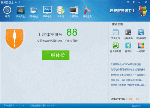 云安服务器卫士是深圳市云安信息技术有限公司技术(简称云安)研发的服务器安全防护软件,是为idc运营商、企业主机、服务器管理者等用户提供服务器安全防护的实用软件,服务器卫士是一款集服务器安全防护和安全管理为一体的综合性服务器安全防护工具。是唯一通过u盾安全认证模式的管理软件,通过u盾加密内核认证算法模式,“服务器端”+“客户端”双重防范,凡没有通过u盾认证的人,一律无法远程登录服务器进行管理,服务器卫士功能涵盖了服务器 系统安全、优化、权限、守护及时修复,ip端口安全策略、自定义 ip策略系统防火墙,web入侵防御,数据库入侵防御,系统性能监测等多方面功能模块,为用户在服务器运营过程中提供完善的防护,使其免受而已的攻击、入侵。