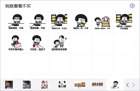 我就看看不买表情包是一款十分有趣的表情包,对于购物无法自拔的女人们,快醒醒吧,快想起来你自己说的的“我就看看,我不买”。本站提供最新,最潮流表情包下载,有需要的用户请放心下载我就看看不买表情包。