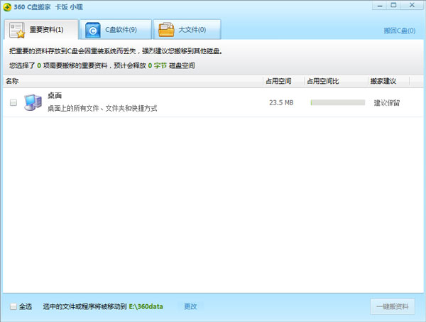 此外,360的“C盘搬家”还能把用户存放在C盘的重要系统资料移到其它磁盘,同样能提升电脑速度,而且不会因为系统重装或崩溃而丢失资料。对一台普通家用电脑来说,“C盘搬家”通常能为C盘节省上G的空间,是一项方便又实用的功能。