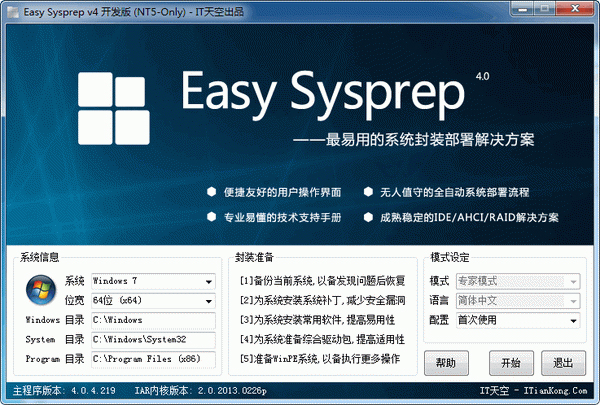 【Easy Sysprep】概述:Easy Sysprep(简称ES)是IT天空出品的一款 Windows 操作系统封装部署辅助工具。它以微软系统准备工具 sysprep.exe 程序为核心,以微软官方文档为理论依据,结合广大系统工程师、系统维护人员、系统爱好者的实战经验,将系统封装部署的各步骤进行有机的整合。Easy Sysprep 有如其名,力求将复杂的 Windows 操作系统封装过程变得简单实用。