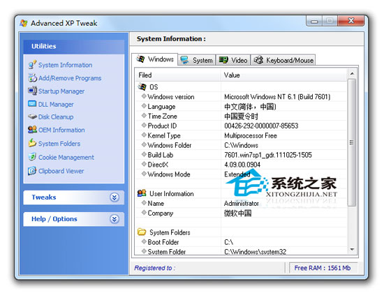 Advanced XP Tweak下载Advanced XP Tweak 是一个功能强大的WindowsXP专用系统设置工具,他可以帮助你对很多系统隐藏的功能选项进行调整,内置启动程序管理器,帮助你自定义需要随系统启动的程序,程序支持自定义系统OEM信息,自定义系统文件夹和路径,实时剪贴板监视功能,支持系统缓存优化功能,支持对的IE调整优化加速,可以对网络连接速度进行优化操作,清除Cookies,设置任务栏的透明度,支持任意调整桌面选项,非常强大!