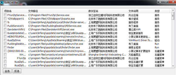 2、软件原理是读取启动项的数字签名,跟sign、txt内置的对比,符合就列出来。像布丁压缩、布丁桌面、值购助手、智能云输入法、快压、小黑记事本、小鱼便签等带数字签名的流氓软件能轻松解决。
