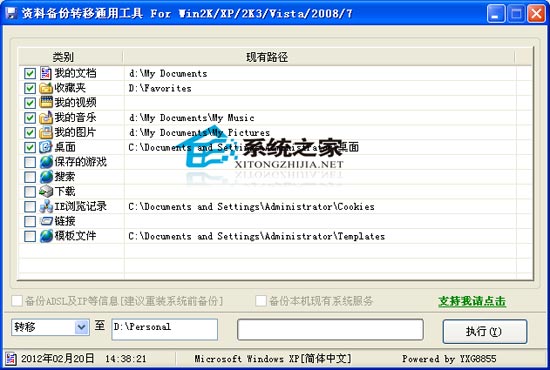 特别提醒:为防止个人资料丢失,重装系统前建议备份当前系统的个人资料,特别是网址收藏夹、保存到桌面的文件、ADSL和IP、上网COOKIES资料等的备份尤为重要。对新安装的安装版系统建议用此工具转移资料路径到非C盘(GHOST系统一般已转移)。