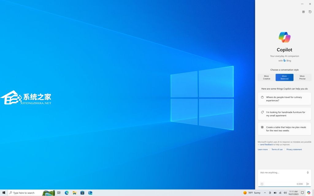 Windows 中的 Copilot按钮将显示在 Windows 10 中任务栏的右侧。选择它后,Windows 中的 Copilot 将显示在屏幕右侧。它不会与桌面内容重叠或阻止打开的应用程序窗口。