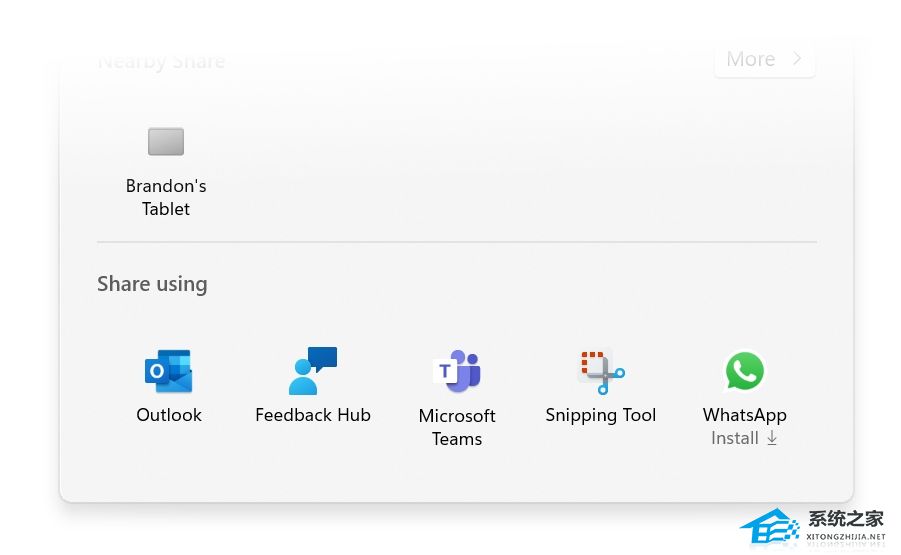Windows 共享窗口现在支持在“共享使用”部分下与 WhatsApp 共享。如果您没有安装 WhatsApp,您可以选择直接从 Windows 共享窗口安装。随着时间的推移,我们也计划在其他应用程序中尝试这种体验。
