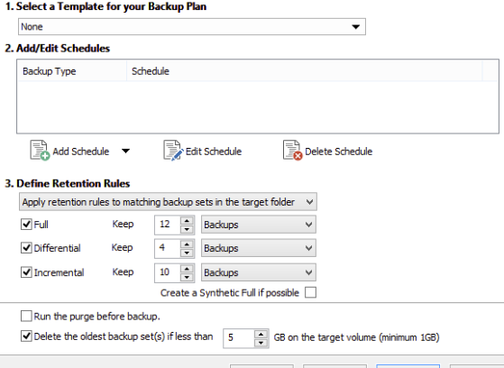 图像向导的第二页是创建或编辑“备份计划 ”的地方。这为备份定义了备份计划和保留规则。