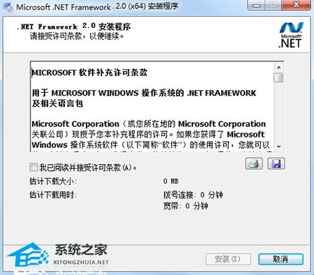 2. 然后进入.net framework 2.0安装协议界面,您可以阅读协议中的内容,阅读完成后勾选【我接受协议中的条款】然后点击【安装】。