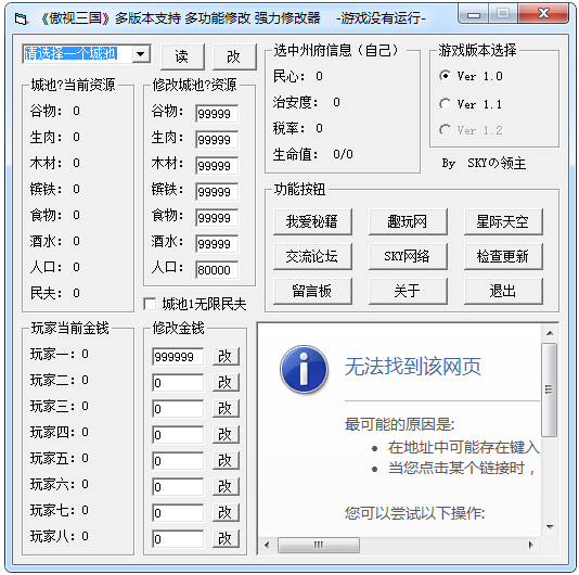 读取当前游戏数据,然后自由修改谷物、生肉、木材、镔铁、食物、酒水、人口、民夫八项数据。