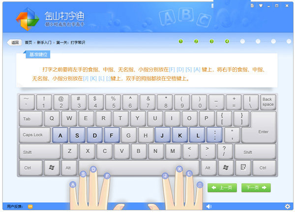 5. 其中基准键位是打字的基础,它引导用户如何将手指放在键盘上进行打字,每个手指都有各自的键位,不能放错,养成了习惯后,后面打字才会飞快。