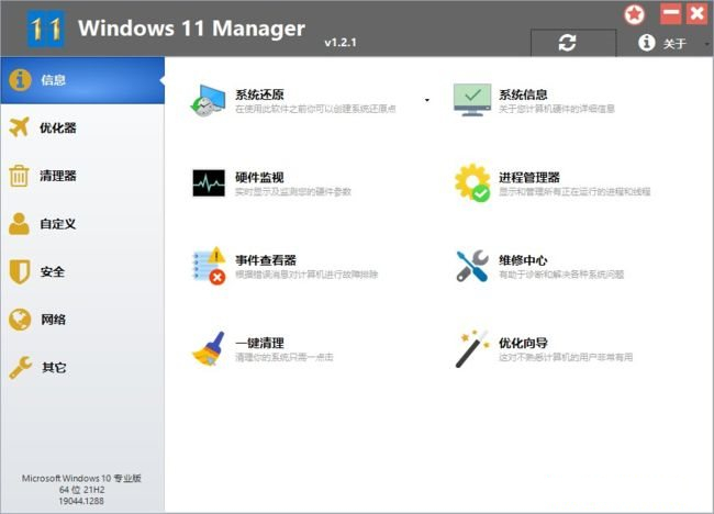 Windows 11 Manager是一款集Windows11所有功能于一身的Win11系统优化工具,该软件功能非常多,打开主界面就可以查看到各种功能分类,全部工具都可以免费使用,能实现优化、调整、清理、加速和修复Windows 11,满足您对系统优化调整的所有期望。