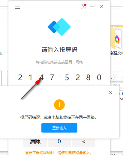 6. 投屏码错误,或者电脑和终端不在同一网络。小编没有投屏设备所以就不演示了。