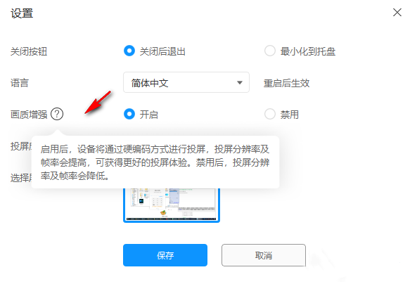 5. 画质增强:启用后,设备将通过硬编码方式进行投屏,投屏分辨率及帧率会提高,可获得更好的投屏体验。禁用后,投屏分辨率及帧率会降低。