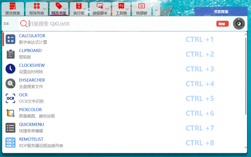 可以统一搜索windows开始菜单、程序列表、程序组、键鼠脚本、书签网址、快捷菜单、rdp服务器、工具箱等所有数据。