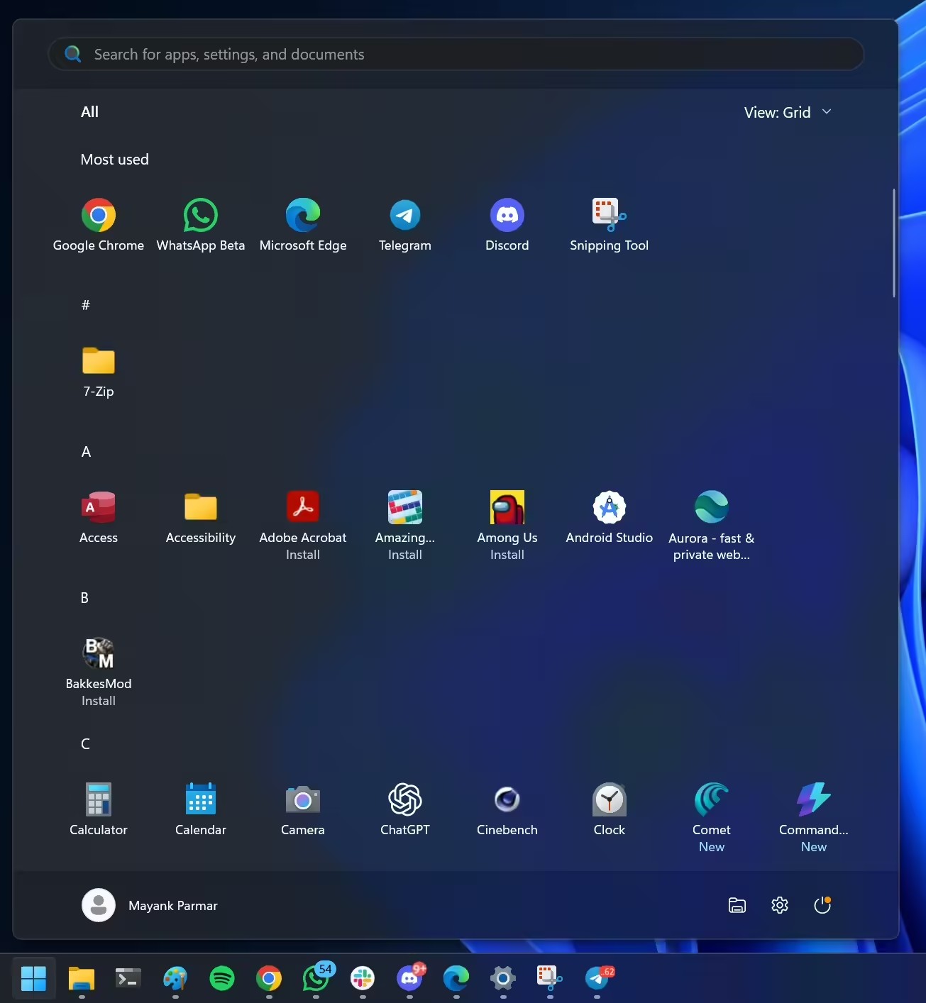 微软为此设计了两种新视图:“分类”视图会根据应用功能(如“娱乐”)自动分组,这一分类逻辑依赖一个本地存储的 15MB JSON 文件,完全离线运行;而“网格”视图则以更紧凑的图标阵列展示所有应用,并保留了按字母排序的传统方式。