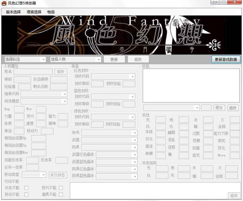 风色幻想5修改器是游戏风色幻想5的辅助工具,包含内容全面,支持简繁体版修改器,修改时注意选好对应版本,基本上你能想到的它都能改,武器,防具,刻纹,抗性等等等,让你无压力通关那是毫无问题的!