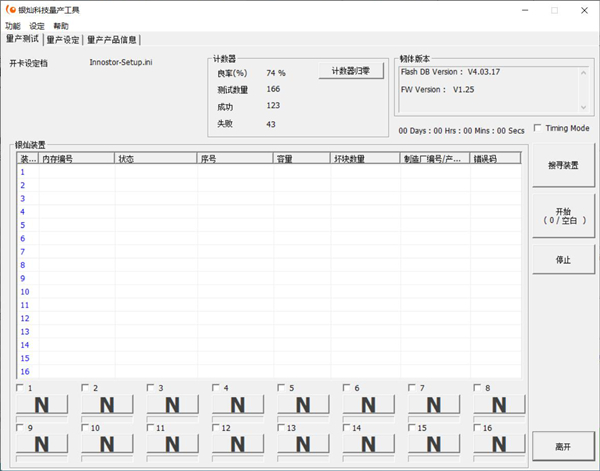 2、量产测试完成会显示”ОООО”(Pass)或”ХХХХ”(Fail)。 在”Innostor Device Item”会显示开卡讯息与状态(如 Flash ID, Status, Serial No., Capacity, Bad Block Count, VID/PID 与 ErrorCode)。