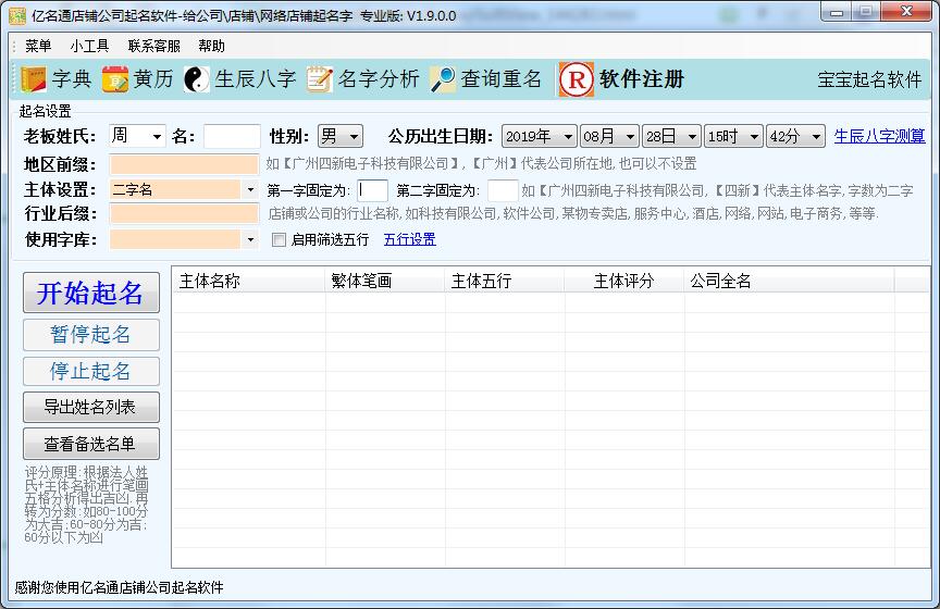 亿名通店铺公司取名软件,你只需要输入法人的基本信息、公司地名、行业名称等即可自动在数秒之内生成数万以上的高分吉日名字。你可以轻松选出好听,满意的好名字,另外可以测算公司名字详细分析及打分,为您的公司或店铺起个吉祥如意、生意兴隆的好名字!