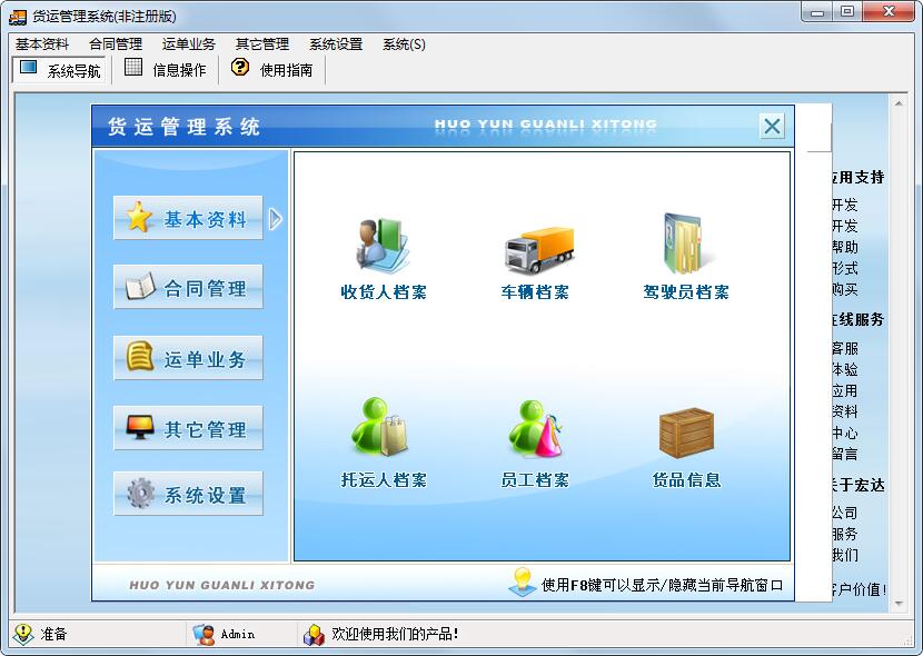 宏达货运管理系统是一套对收货人档案;车辆档案;驾驶员档案;托运人档案;员工档案;货品信息;货运合同;运单业务;交通事故管理;驾驶员违章登记、查询进行全面管理的系统。