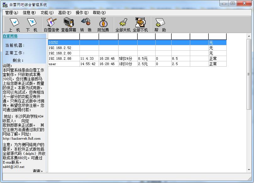 白雪网吧综合管理系统是一个非常强大好用的网吧自助管理工具。适用于各大小网吧服务器,白雪网吧综合管理系统功能非常强大,拥有计费,定时刷新,上机,下机,远程控制等等功能,适用于各大小网吧服务器,使用起来也非常的方便,简单。