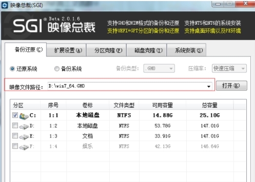 1、打开SGI映像总裁,然后软件会自动读取D盘我们下载的系统文件,在映像文件路径可以看到。然后勾选执行完成后重启,点击执行。
