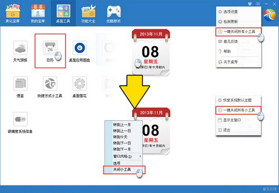 在桌面工具界面,对工具直接左键单击即可添加小工具到桌面。对已启动的小工具右键选择关闭小工具或桌秀菜单、桌秀系统托盘菜单都可以关闭小工具。