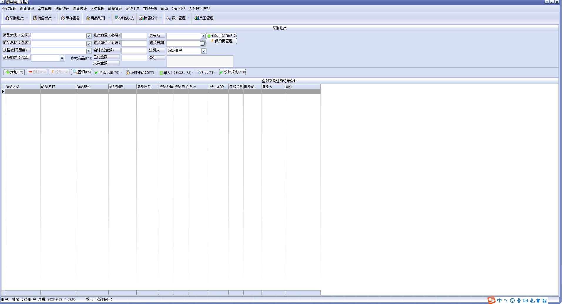 采购进货:对您的采购进货记录进行管理,可以新增,修改,删除销售记录,并可打印导出EXCEL查看。