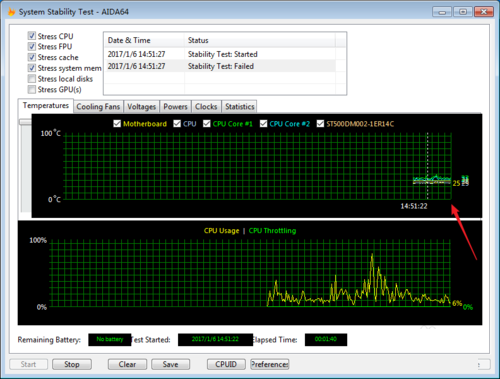 5、最后,AIDA64烤机测试完成,如下图:线条起伏不大,表明小编的电脑还是可以的哦。小伙伴们可以下载后测试自己电脑哦。