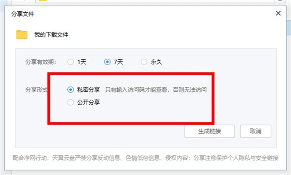 4. 生成链接后我们只需将该链接分享给其他用户,其他用户就可以下载我们分享的文件了。私密链接的话还需将访问码一同分享给其他用户。