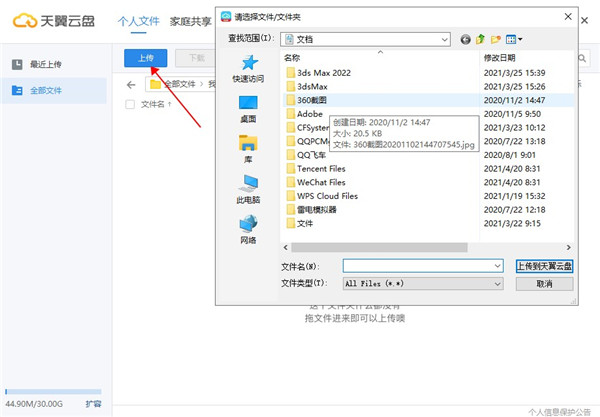 2. 或者点击软件界面的上传两个字,选择你需要上传的文件即可。