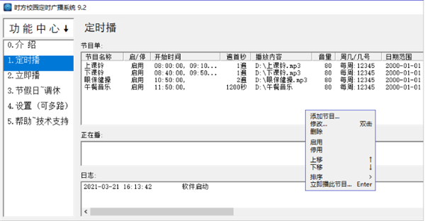 时方校园定时广播系统,此软件可用于学校自动打铃,定时广播课间操、背景音乐,支持电脑自动开关机。通过电脑软件定时播放音乐,并将电脑音频输出连接至功放机,此方案具有简单灵活、成本较低的优点。