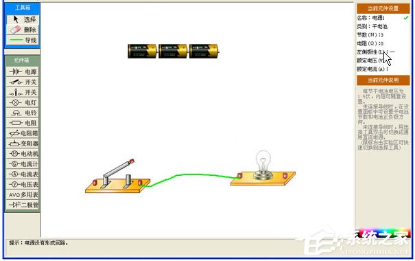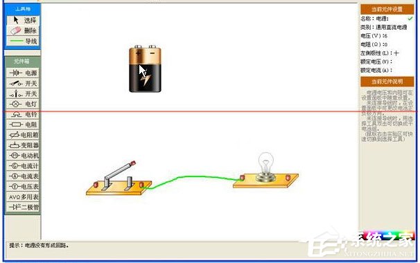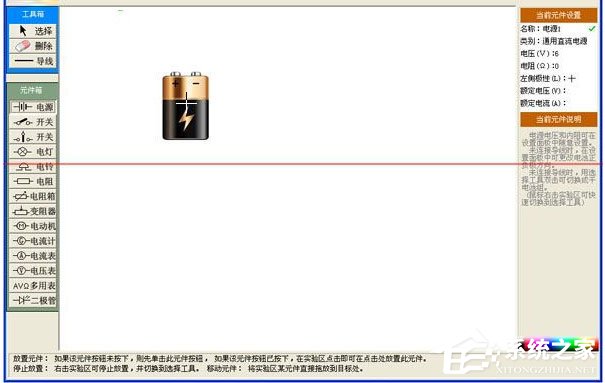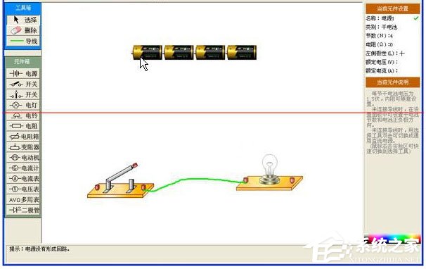 当电源未连接导线时,使用选择工具(用鼠标右击实验区空白处可快速切换到选择工具)双击电源就可以在通用直流电源或干电池组之间随意切换。如果想切换已连接导线的电源,则需先删除或挪开与此电源连接的导线才能切换。 干电池组节数可在设置面板中设置。