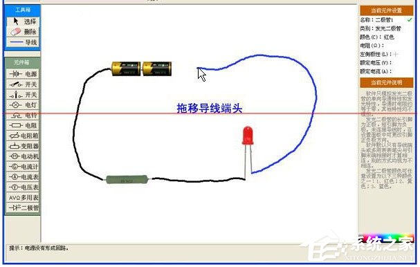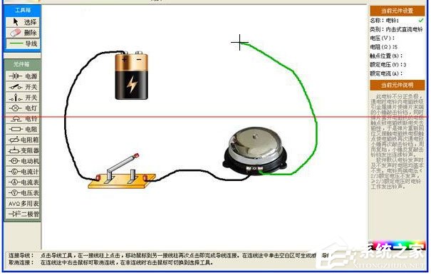 程序只允许用导线连接元件接线柱,不允许用导线去连接导线,也不允许用导线去连接多用表表笔(只可用表笔去接触导线端头)。连接导线方法:先单击工具箱中的导线工具 ,然后移动鼠标到实验区,这时鼠标指针变成“┼”图形,点击元件的接线柱,然后移动鼠标,导线即按鼠标移动轨迹显现,当鼠标移动到另一元件接线柱时,再次点击接线柱即可完成两个接线柱间的导线连接。在连接导线中途右击鼠标可取消本次导线连接。只要导线工具按钮呈按下状态,可连续连接导线。若想取消导线工具,可在非连线时右击实验区(或在连线时两次右击实验区)切换为选择工具。程序设定在一种情况不能连接导线:当三接线柱的电表的其中一个正极接线柱连有导线时,另一个正极接线柱不允许再连接导线,只有删除此正极接线柱的导线后才能在另一个正极接线柱连接导线。画导线过程中也可以在空白区点击生成只有一端连接元件的游离导线。想画彩色导线可在画导线状态下点击右下角的导线颜色条再画导线。