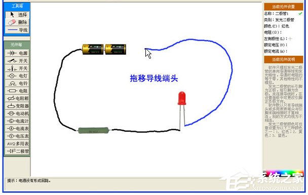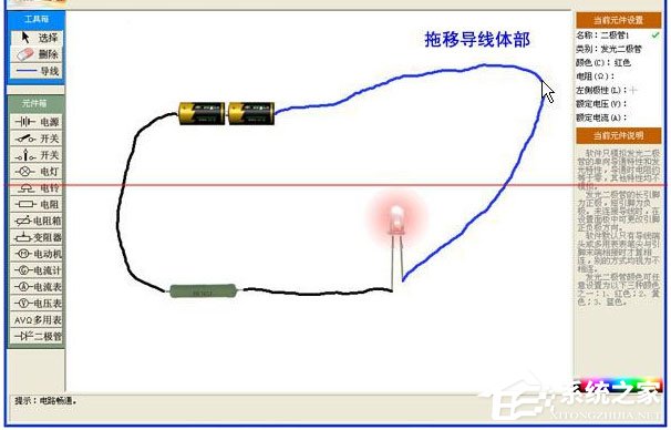 移动导线需先确认后移动,具体操作方法是:使用选择工具(用鼠标右击实验区空白处可快速切换到选择工具)单击导线易分辨处确认此导线,然后移动鼠标到此导线的需移动的部位按下鼠标左键并拖动导线即可。如果拖动导线头到某元件接线柱附近放开鼠标左键,导线头将自动与此接线柱连接。软件不允许有两端都不连接元件的导线,如果拖动游离导线连接元件一端,此导线将被删除。如果游离导线过短不易辨认也会被删除。