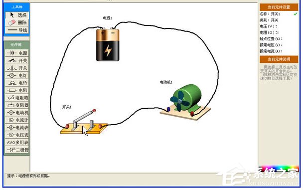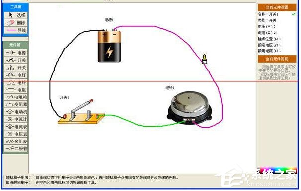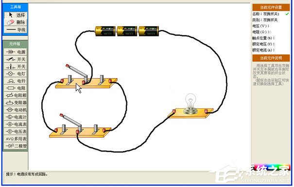 使用选择工具(用鼠标右击实验区空白处可快速切换到选择工具)双击实验区中的开关,如果双击前开关是张开的,双击后将变为闭合状态。反之,如果双击前是闭合的,双击后将变为张开状态。