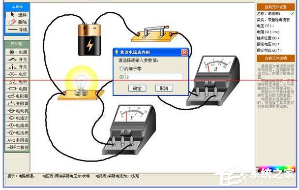 使用选择工具(用鼠标右击实验区空白处可快速切换到选择工具)点击实验区元件,设置面板即显示此元件的各项参数。如果参数值呈黑色(或红色),表示参数值可以修改,点击参数值,则弹出参数输入框,可在输入框中输入自定义参数值,点击确定完成修改。如果参数值呈灰色或参数值为空白,表示此参数不可修改,点击后无反应。当参数值为红色,表示电源不是理想电源或者电表不是理想电表,实验需要考虑内阻因素。