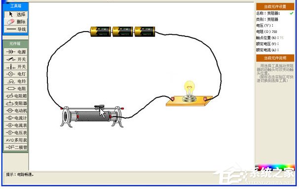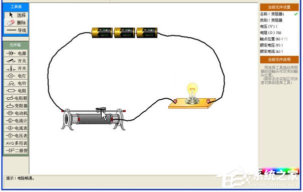 使用选择工具(用鼠标右击实验区空白处可快速切换到选择工具)拖动变阻器的动触头即可改变动触头位置。