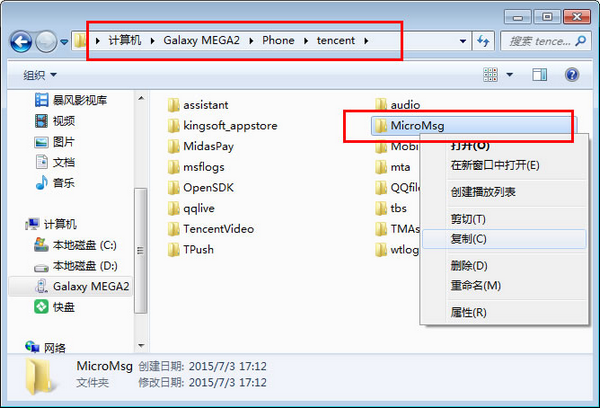 1、将安卓手机与电脑进行连接,并打开手机所在盘符,然后进入tencent文件夹,再将该文件夹下的MicroMsg文件夹复制到电脑的某个文件夹中。复制完成后请将复制到电脑上的MicroMsg重命名为“资源目录MicroMsg”(也可以命名为其它名称,只是后面步骤中还需要复制出来另外一个MicroMsg文件夹,为了防止覆盖,也为了防止发生混淆,所以需要对其进行重命名)。